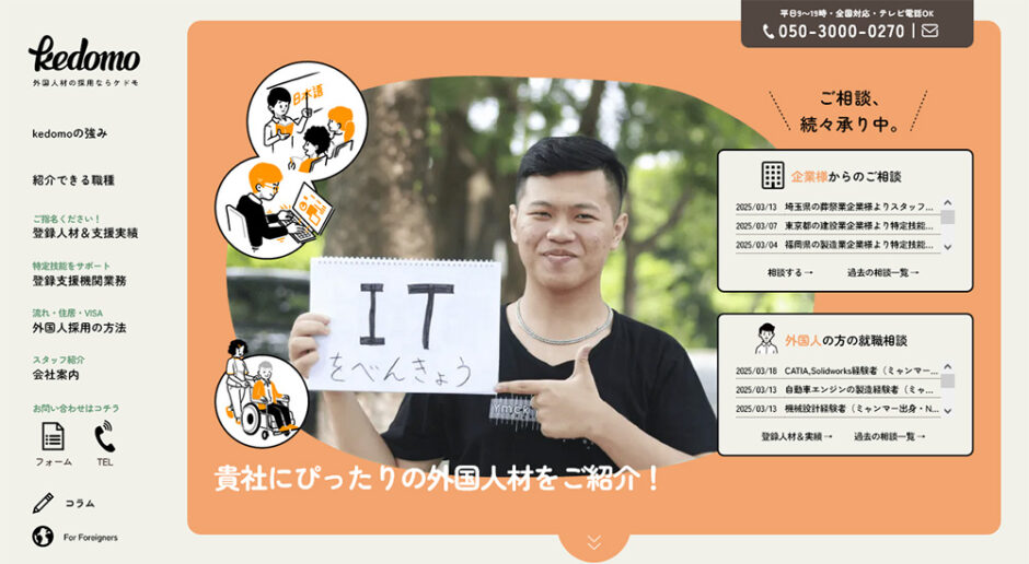 kedomoは、コミュニケーションを大切にし、企業や求職者に安心して頼ってもらえるような存在を目指す企業です。採用前のスキルや日本語力の徹底チェック、採用後の日本語教育や生活サポートまで一貫した支援を提供。